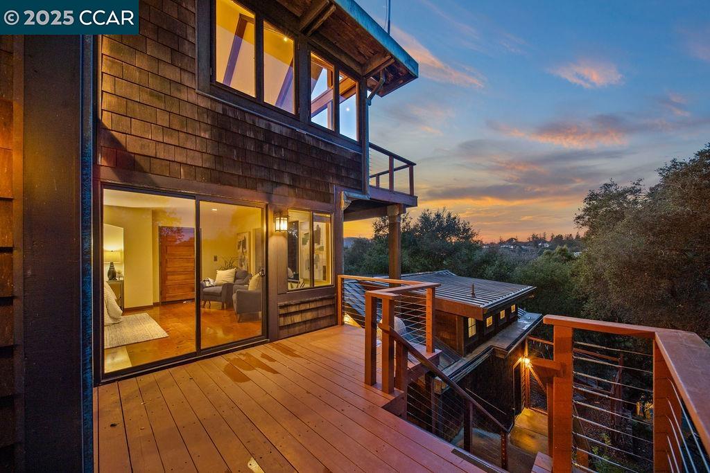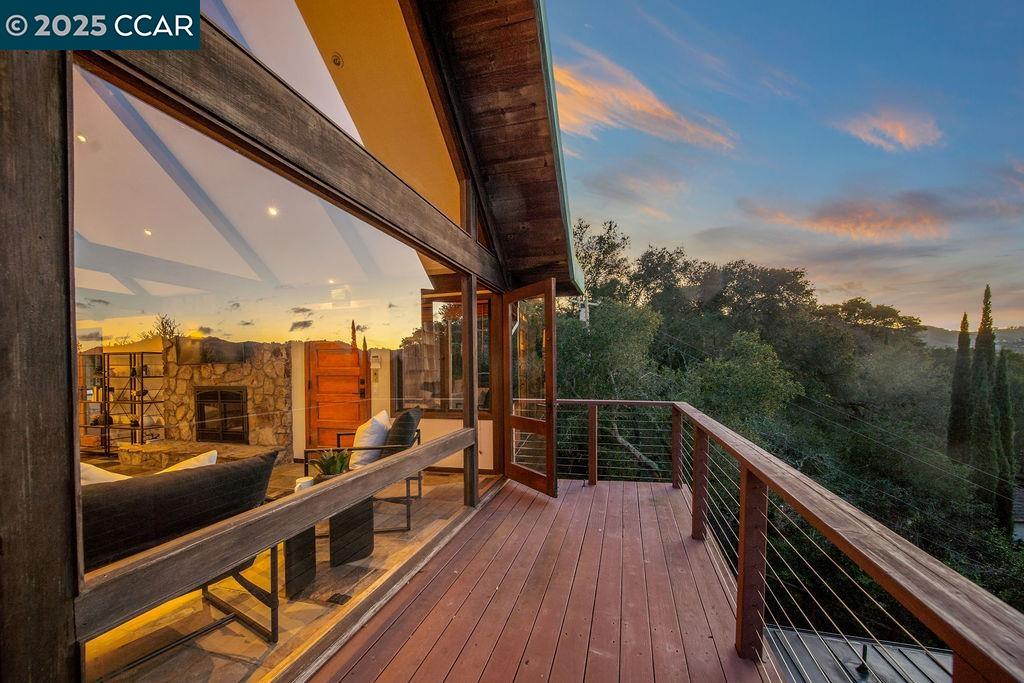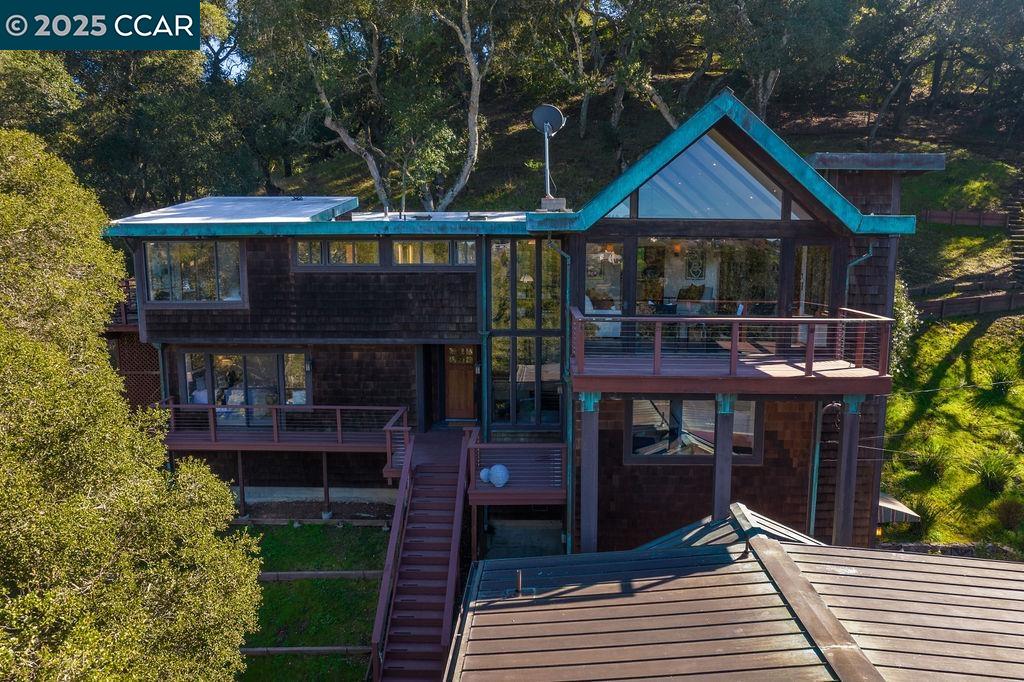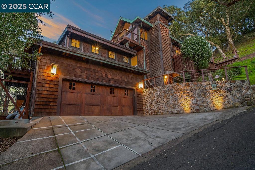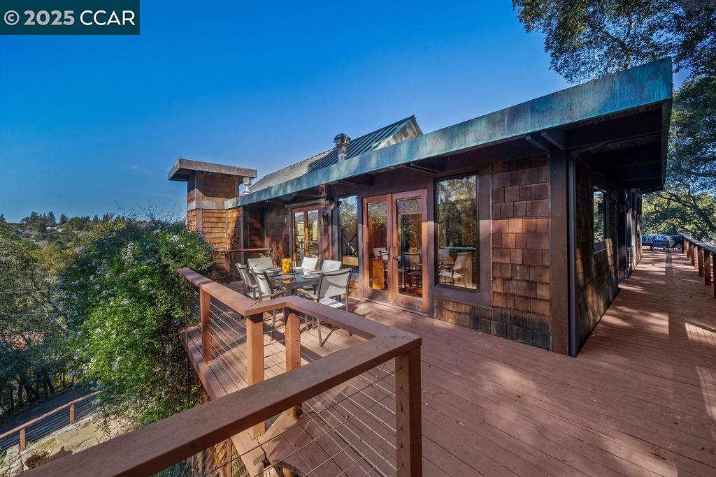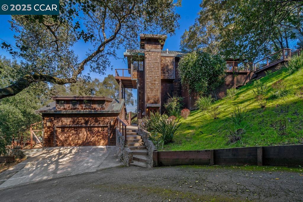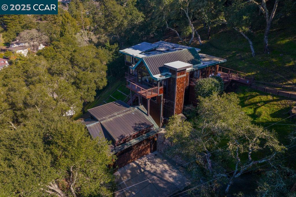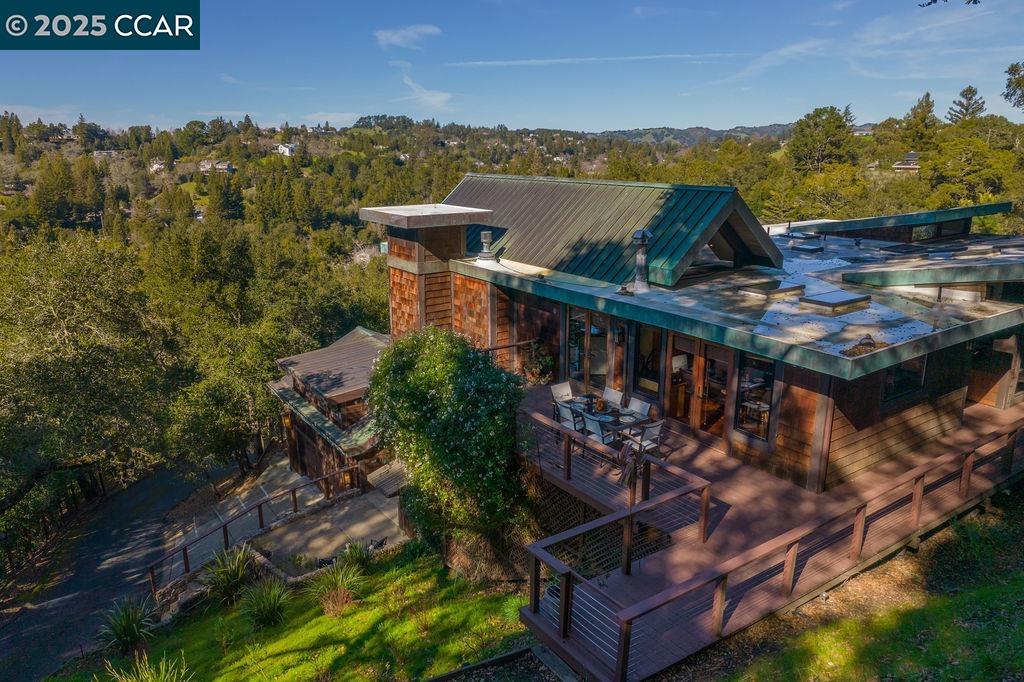 Welcome to 26 Moraga Via, a gorgeous Craftsman home with breathtaking views, nestled in a private, scenic setting in Orinda, California. Built in 1968 and completely updated, the main residence offers 5 bedrooms and 5 full bathrooms across approximately 3,500 square feet. The kitchen includes granite countertops, custom alder cabinetry, stainless appliances, a large island, and French doors which access a deck which wraps around the home. Each bathroom has been meticulously updated with custom tile work. An elevator ensures easy access to the home. Copper roofing and gutters offer durability and unmatched patina. The living room includes a cozy gas fireplace, vaulted ceiling, and expansive views of the Orinda hills. The 450 sq ft ADU studio apartment with full kitchen was built in 2014 and offers space for a nanny or parent, or a rental opportunity. Located in the desirable Glorietta neighborhood, this home provides access to some of the top schools in the State. Your serene tree house packed with amenities awaits.