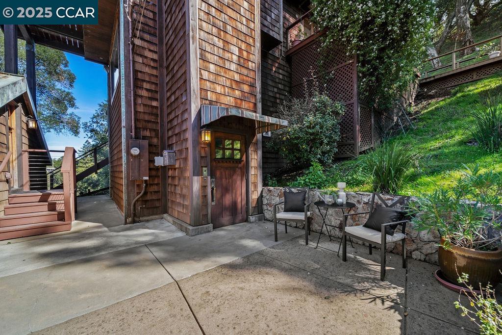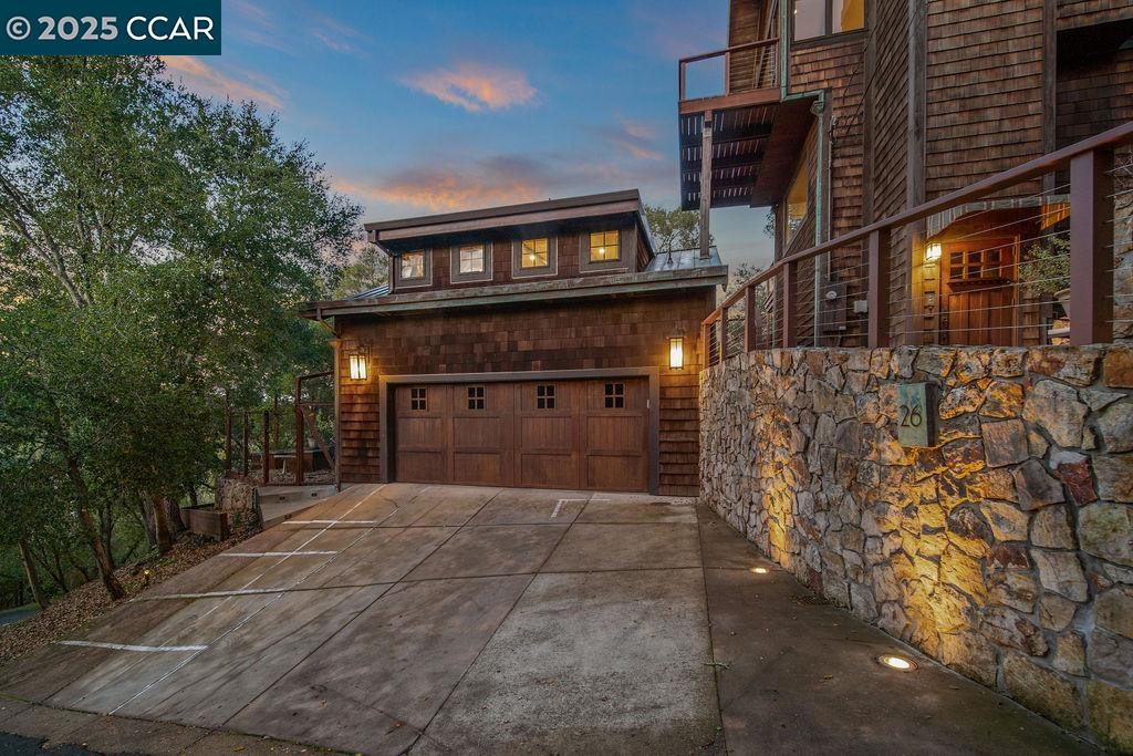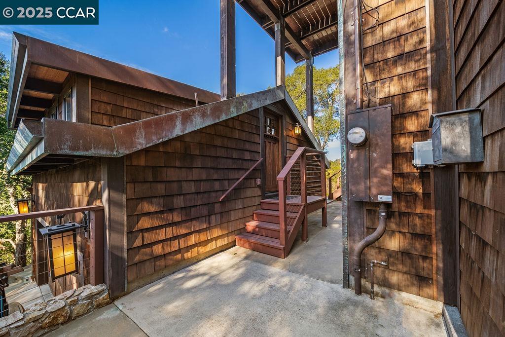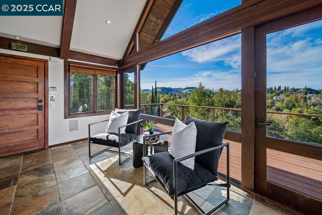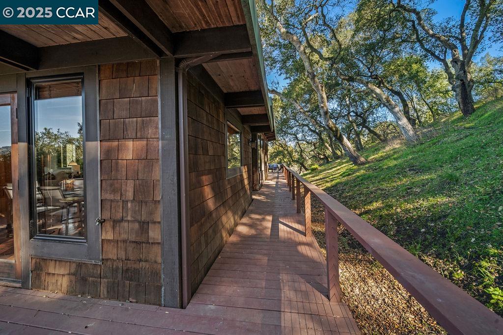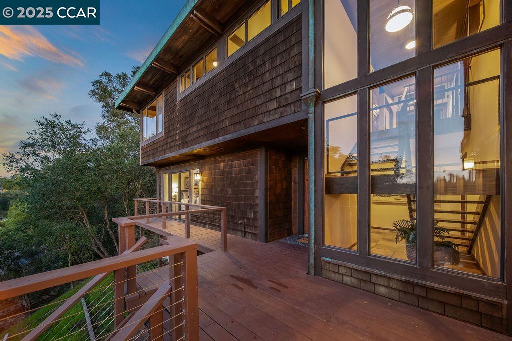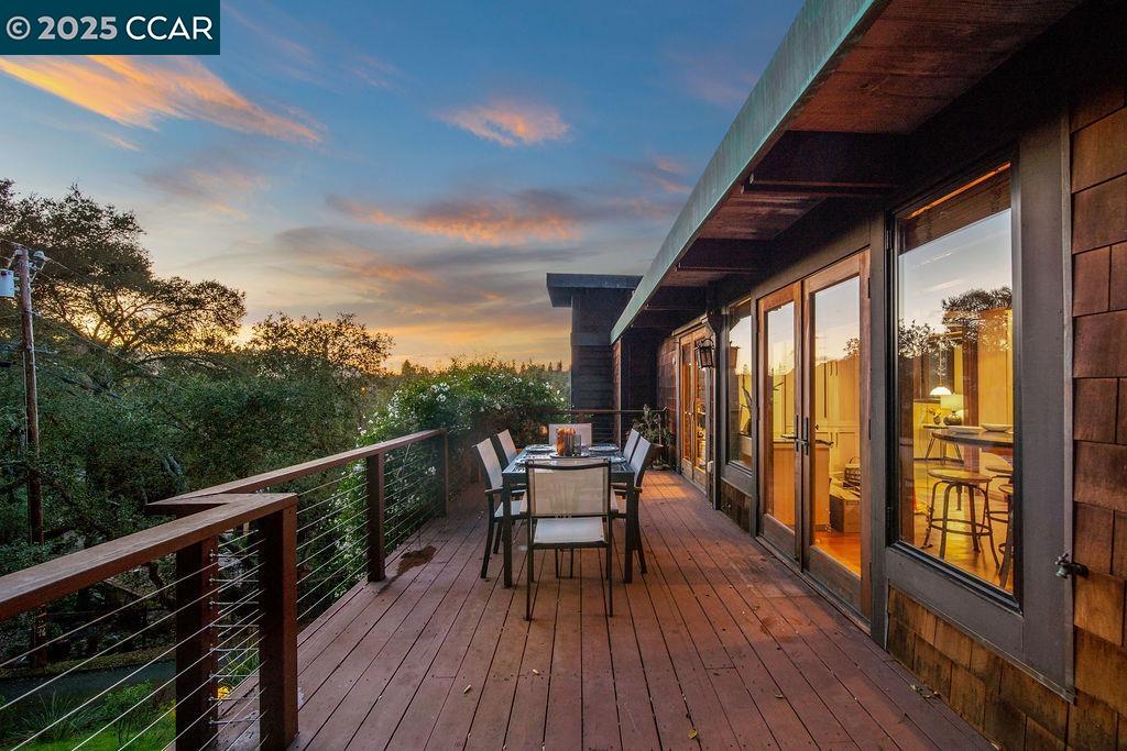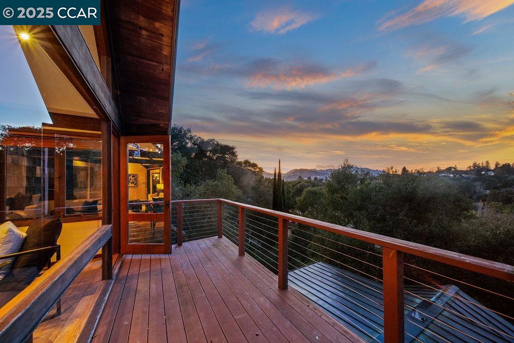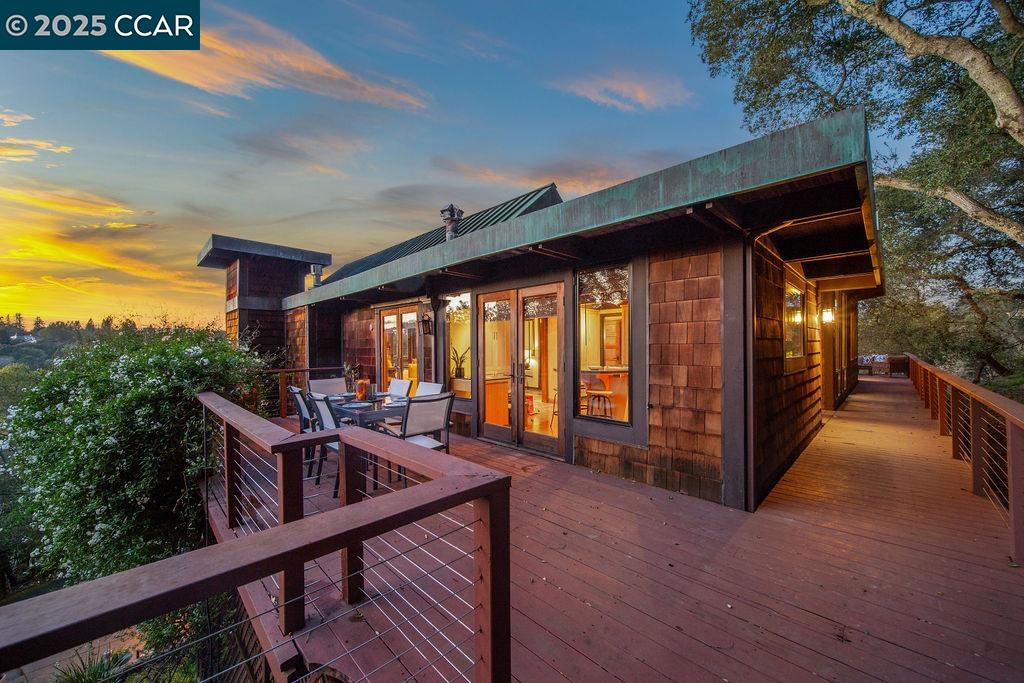 Welcome to 26 Moraga Via, a gorgeous Craftsman home with breathtaking views, nestled in a private, scenic setting in Orinda, California. Built in 1968 and completely updated, the main residence offers 5 bedrooms and 5 full bathrooms across approximately 3,500 square feet. The kitchen includes granite countertops, custom alder cabinetry, stainless appliances, a large island, and French doors which access a deck which wraps around the home. Each bathroom has been meticulously updated with custom tile work. An elevator ensures easy access to the home. Copper roofing and gutters offer durability and unmatched patina. The living room includes a cozy gas fireplace, vaulted ceiling, and expansive views of the Orinda hills. The 450 sq ft ADU studio apartment with full kitchen was built in 2014 and offers space for a nanny or parent, or a rental opportunity. Located in the desirable Glorietta neighborhood, this home provides access to some of the top schools in the State. Your serene tree house packed with amenities awaits.