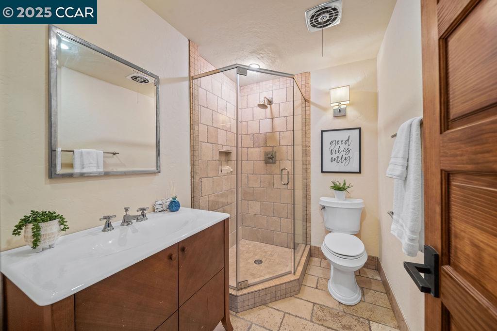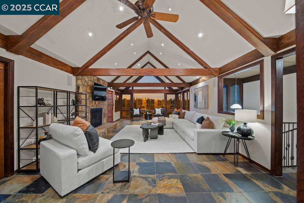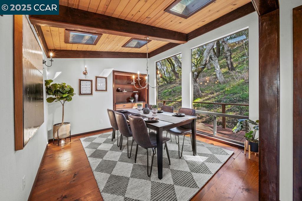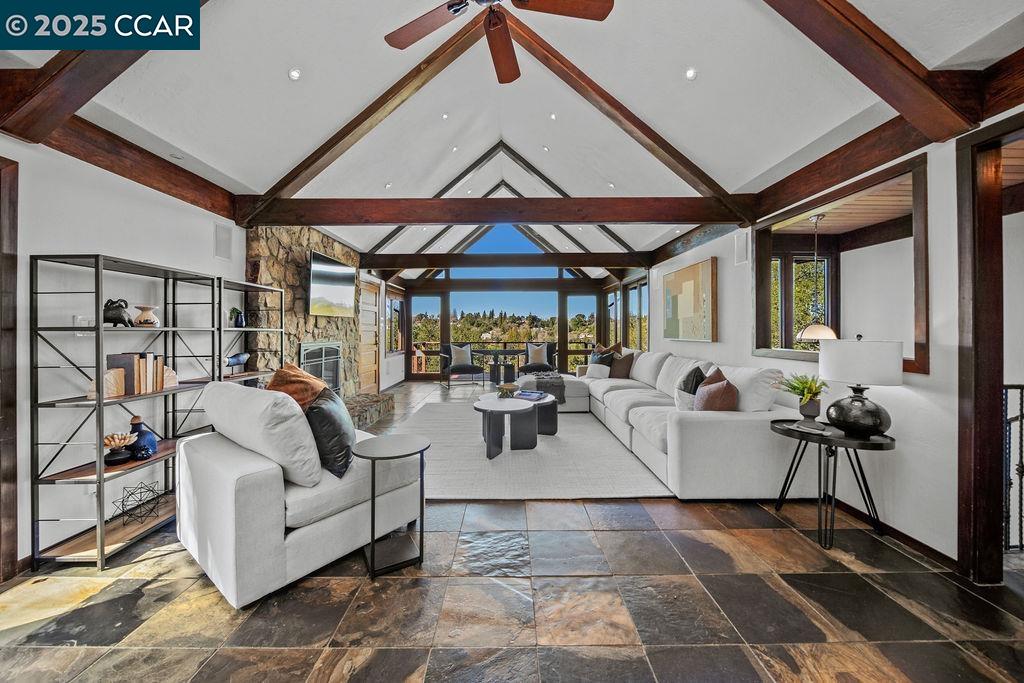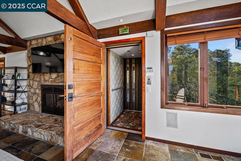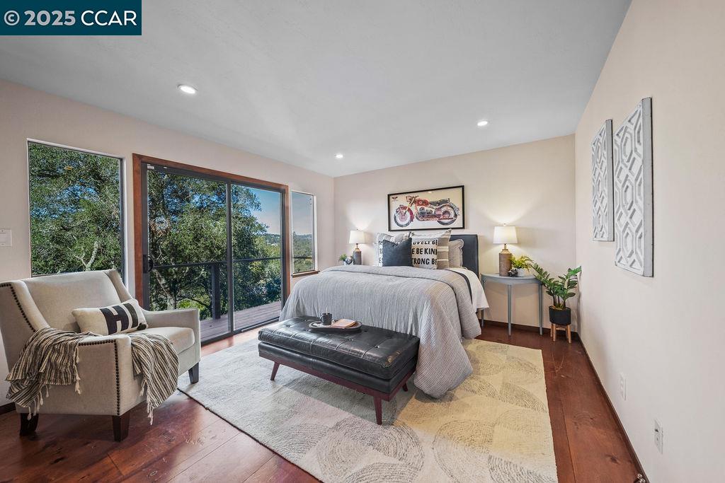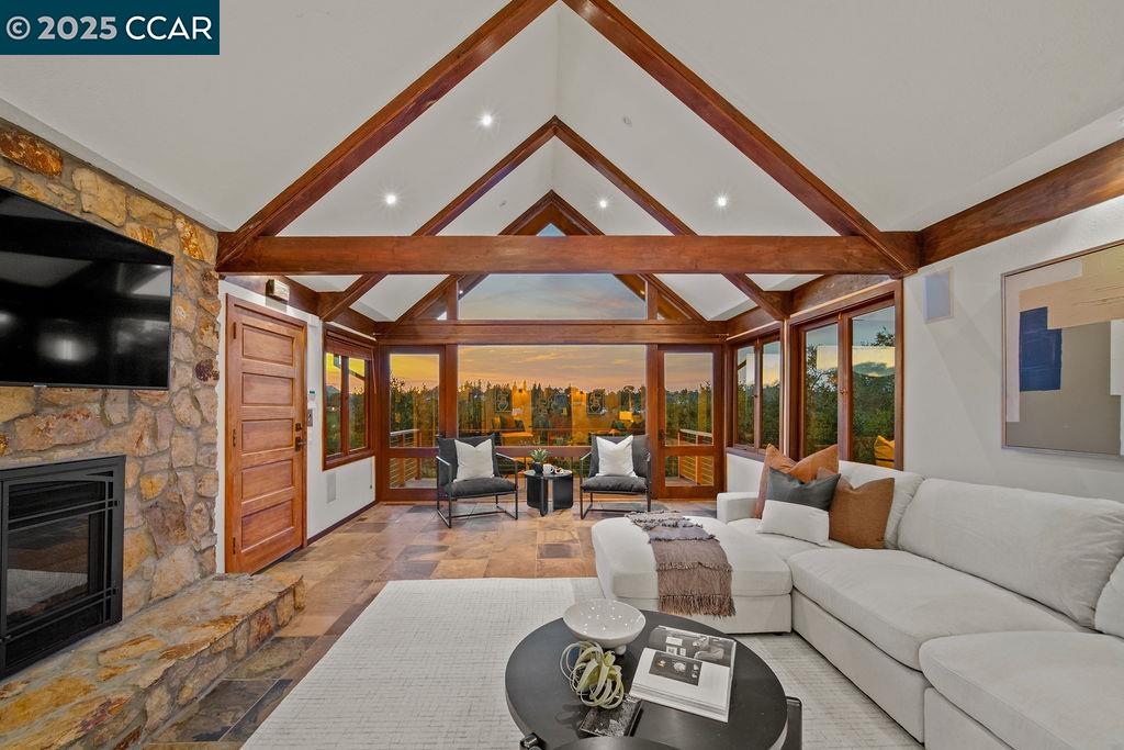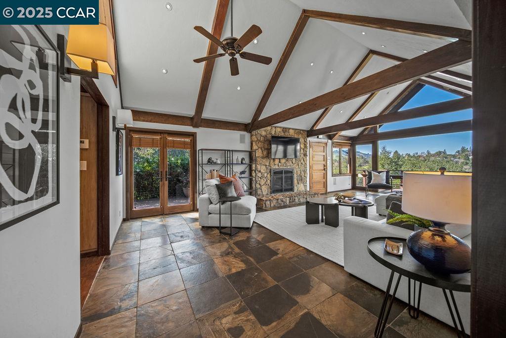 Welcome to 26 Moraga Via, a gorgeous Craftsman home with breathtaking views, nestled in a private, scenic setting in Orinda, California. Built in 1968 and completely updated, the main residence offers 5 bedrooms and 5 full bathrooms across approximately 3,500 square feet. The kitchen includes granite countertops, custom alder cabinetry, stainless appliances, a large island, and French doors which access a deck which wraps around the home. Each bathroom has been meticulously updated with custom tile work. An elevator ensures easy access to the home. Copper roofing and gutters offer durability and unmatched patina. The living room includes a cozy gas fireplace, vaulted ceiling, and expansive views of the Orinda hills. The 450 sq ft ADU studio apartment with full kitchen was built in 2014 and offers space for a nanny or parent, or a rental opportunity. Located in the desirable Glorietta neighborhood, this home provides access to some of the top schools in the State. Your serene tree house packed with amenities awaits.