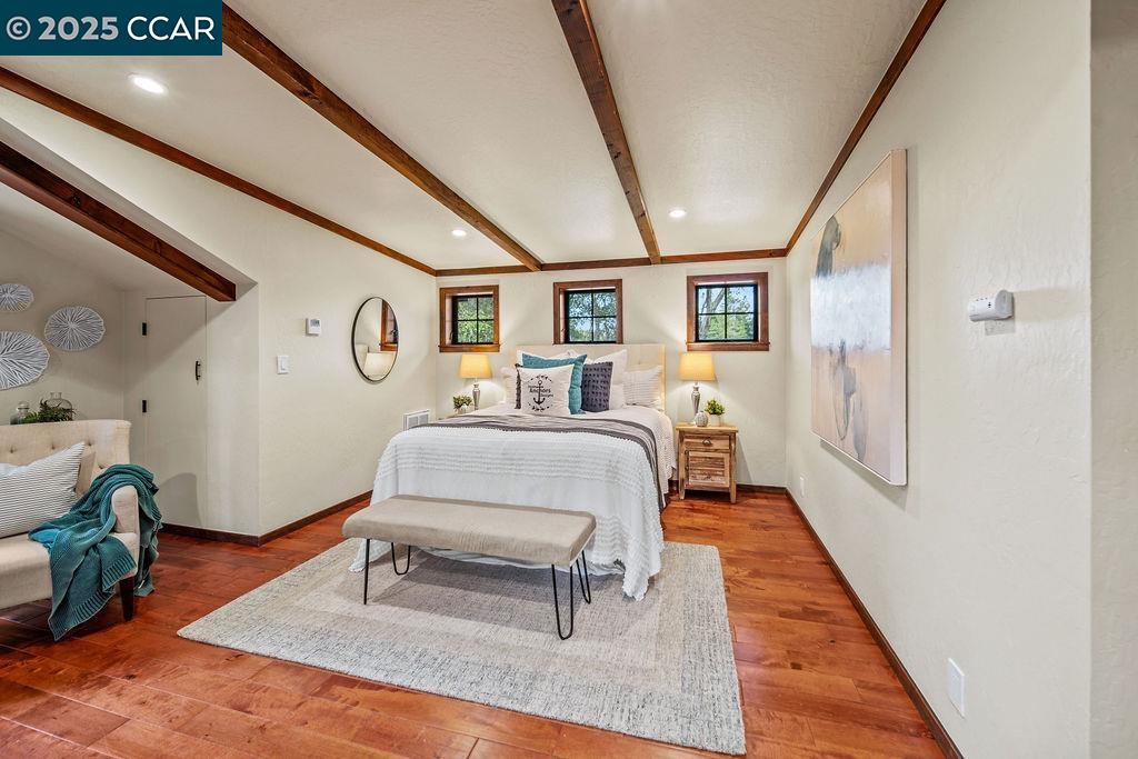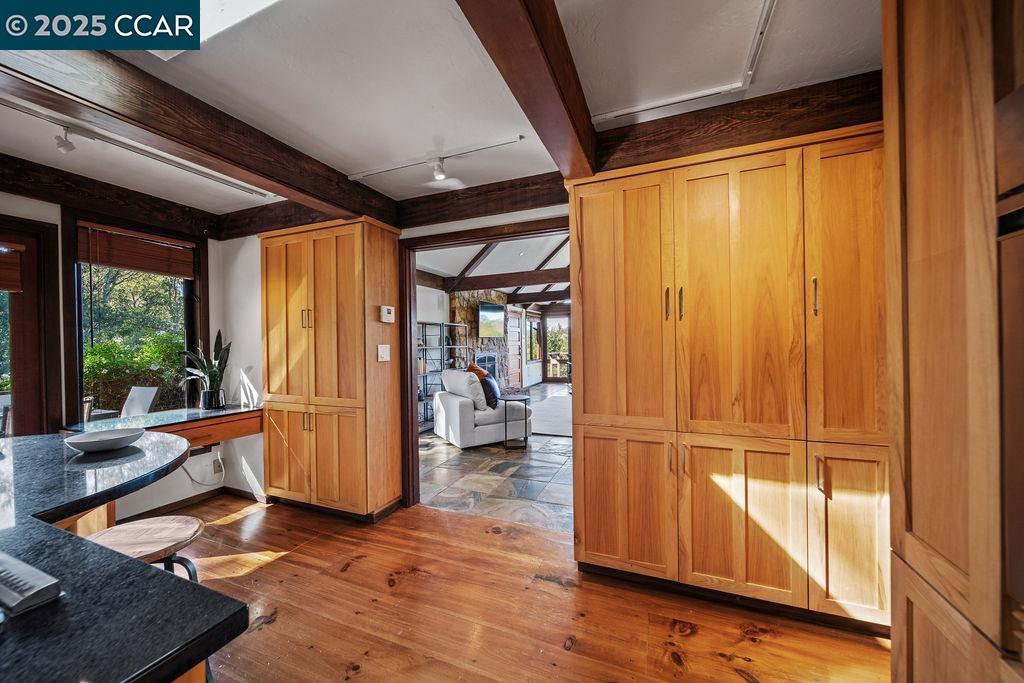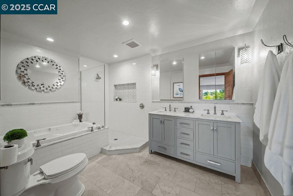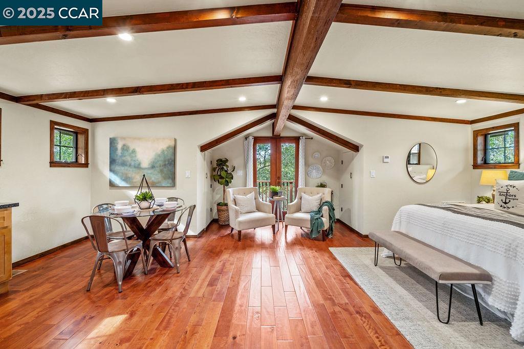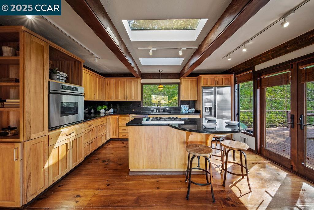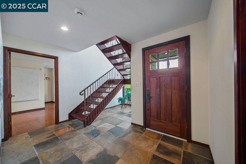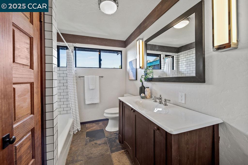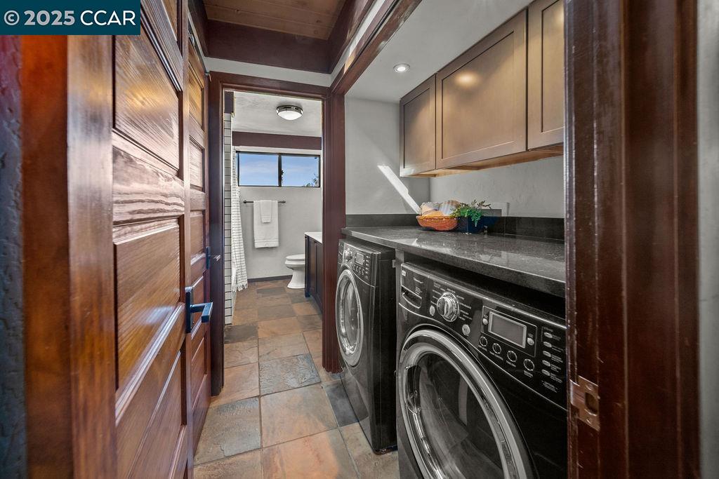 Welcome to 26 Moraga Via, a gorgeous Craftsman home with breathtaking views, nestled in a private, scenic setting in Orinda, California. Built in 1968 and completely updated, the main residence offers 5 bedrooms and 5 full bathrooms across approximately 3,500 square feet. The kitchen includes granite countertops, custom alder cabinetry, stainless appliances, a large island, and French doors which access a deck which wraps around the home. Each bathroom has been meticulously updated with custom tile work. An elevator ensures easy access to the home. Copper roofing and gutters offer durability and unmatched patina. The living room includes a cozy gas fireplace, vaulted ceiling, and expansive views of the Orinda hills. The 450 sq ft ADU studio apartment with full kitchen was built in 2014 and offers space for a nanny or parent, or a rental opportunity. Located in the desirable Glorietta neighborhood, this home provides access to some of the top schools in the State. Your serene tree house packed with amenities awaits.