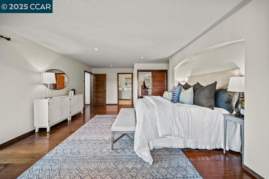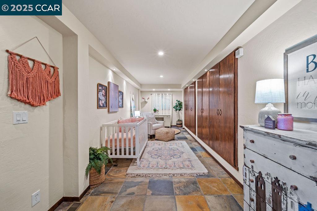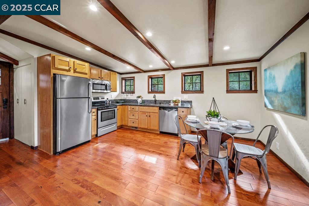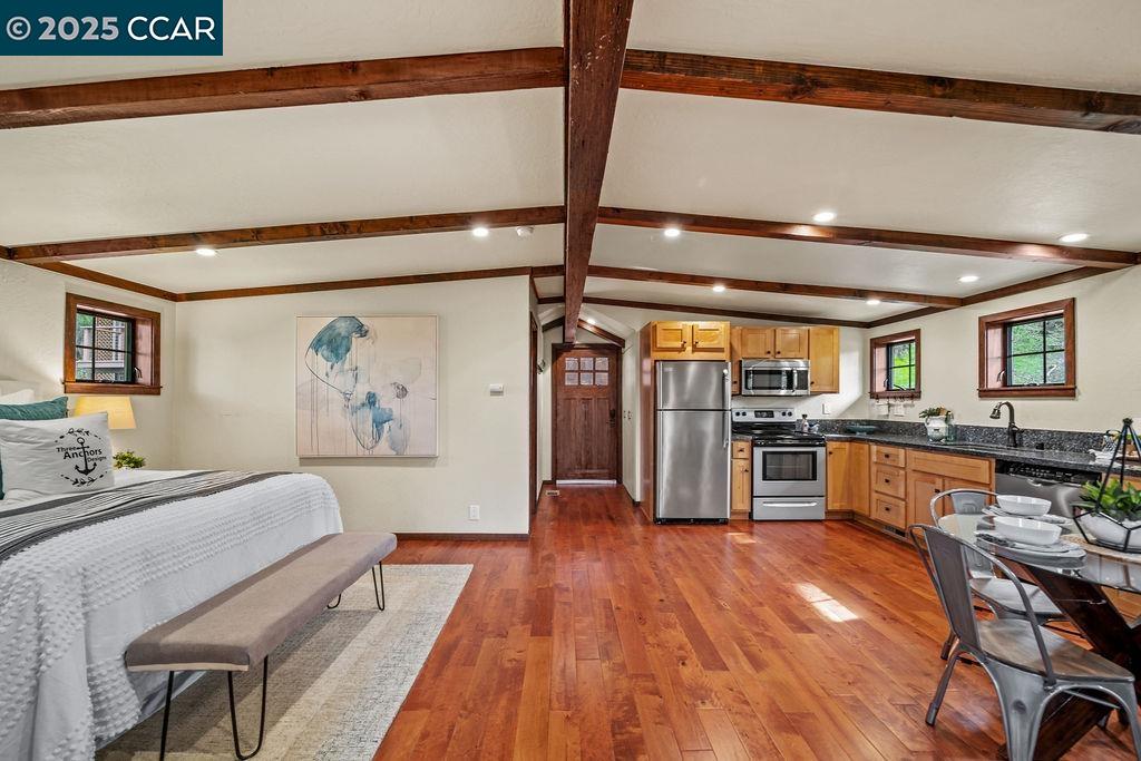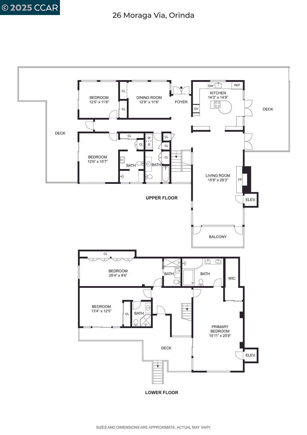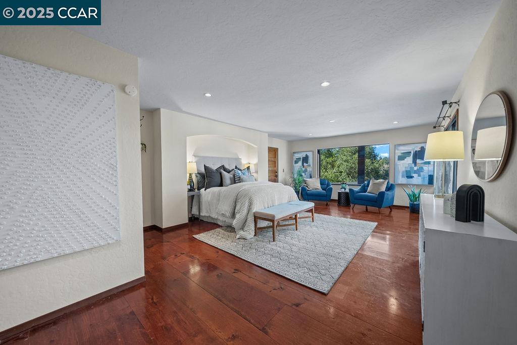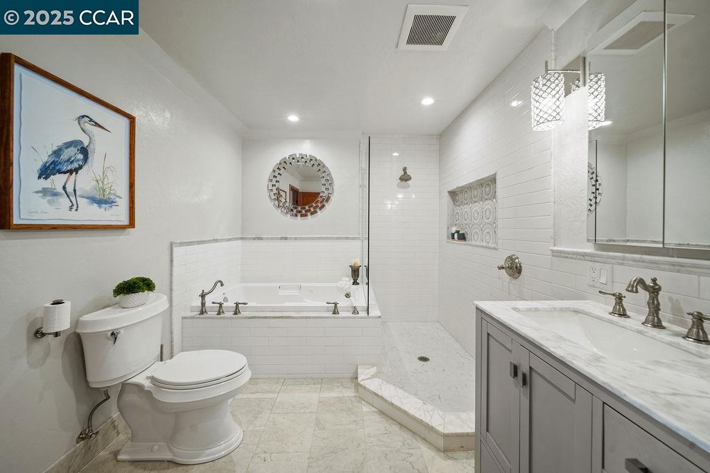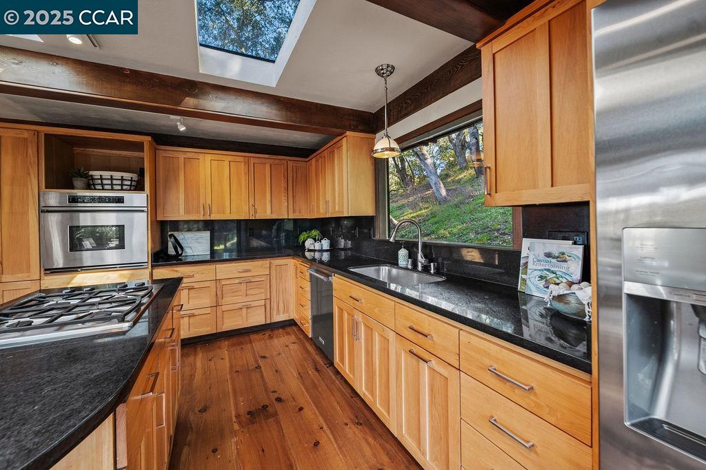 Welcome to 26 Moraga Via, a gorgeous Craftsman home with breathtaking views, nestled in a private, scenic setting in Orinda, California. Built in 1968 and completely updated, the main residence offers 5 bedrooms and 5 full bathrooms across approximately 3,500 square feet. The kitchen includes granite countertops, custom alder cabinetry, stainless appliances, a large island, and French doors which access a deck which wraps around the home. Each bathroom has been meticulously updated with custom tile work. An elevator ensures easy access to the home. Copper roofing and gutters offer durability and unmatched patina. The living room includes a cozy gas fireplace, vaulted ceiling, and expansive views of the Orinda hills. The 450 sq ft ADU studio apartment with full kitchen was built in 2014 and offers space for a nanny or parent, or a rental opportunity. Located in the desirable Glorietta neighborhood, this home provides access to some of the top schools in the State. Your serene tree house packed with amenities awaits.